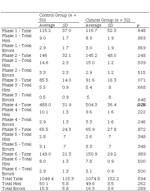 Regarding the measures of emotion recognition, the clinical group presented a significant difference in the execution time of Phase 4 (p = .028), in which the identification of emotions occurred through excerpts of films (Table 2). PB students had a lower performance in time for the emotion recognition, in which, when compared to the other group, it took longer to finish the phase. Regardless of the absence of statistical significance between the groups in the phases, it is relevant to consider that the averages obtained indicated that the clinical group had a lower performance because they got fewer items right, made more mistakes, and took longer to complete the phases.