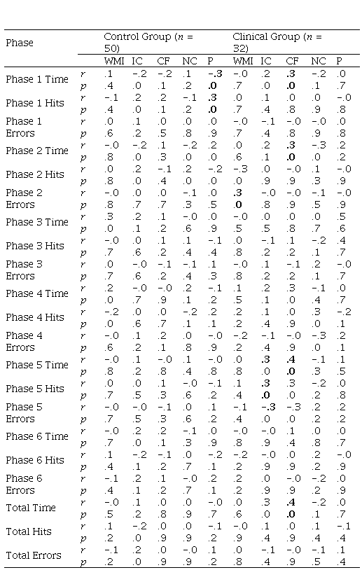 About the emotion recognition, in the clinical group, the cognitive flexibility had correlation with the execution time in Phase 1 (p = .030, r = .384), Phase 2 (p = .026, r = .0392), Phase 5 (p = .016, r = .422) and with the total time (p = .023, r = .0401). The inhibitory control correlated with Phase 5 in time (p = .027, r = .391), hits (p = .043, r = .360) and total errors (p = .043, r = .360). The operating memory was correlated with the total errors of Phase 2 (p = .037, r = .0370). In the control group the perseverations were related to time (p = .17, r = -.340) and hits (p = .17, r = .340) of Phase 1 (Table 3).