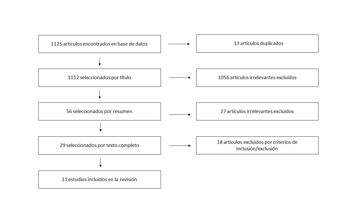 Los artículos se seleccionaron por título, resumen y texto completo, eliminando aquellos que no se vinculaban al tema y también aquellos que no cumplían con los criterios de inclusión/exclusión, obteniendo un total de 11, los cuales fueron incluidos en la presente revisión (Figura 1).