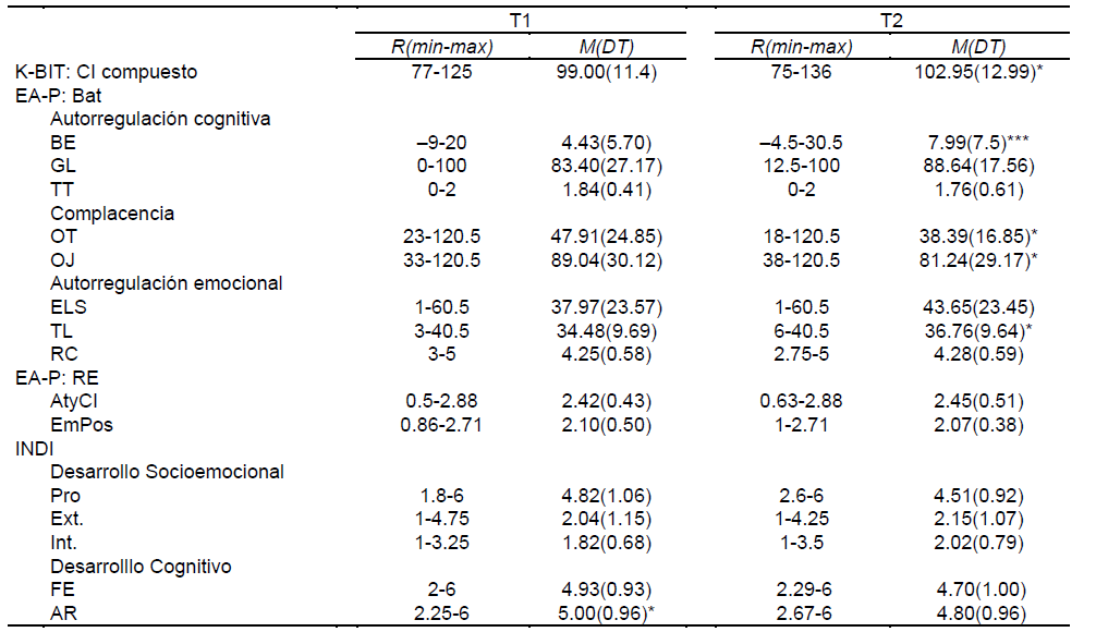 En la Tabla 1 se presentan los estadísticos descriptivos, la comparación de muestras y prueba de significación en la comparación de medias, para las medidas de autorregulación (evaluación directa) y de PPE —incluyendo la subescala de FE y el índice de autorregulación creado para este estudio— (reporte de docente), para T1 (n = 58) y T2 (n = 55).