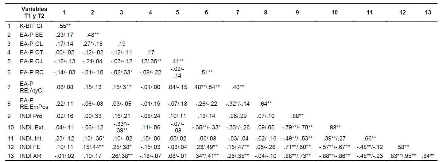 Los componentes del INDI mostraron correlaciones moderadas o muy fuertes entre sí (p < .01) en ambos Tiempos, a excepción de Comportamiento internalizante que presentó correlaciones no significativas en T2 con tres de las cinco subescalas de INDI. En el análisis entre tiempos (test–retest) todas las variables mostraron correlaciones estadísticamente significativas (p < .01) a excepción de GL (rho = .19) y OT (rho = .17).