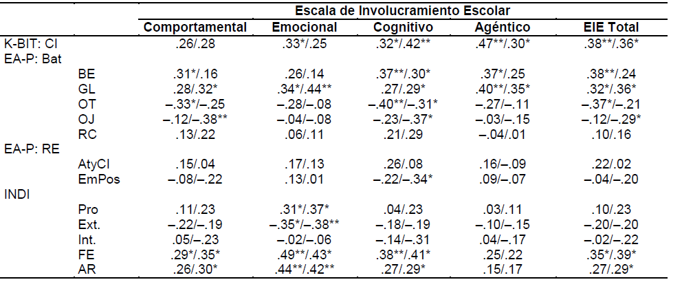 La dimensión de EIE presentó correlaciones de moderadas a altas (desde rho = .31 a .49) y significativas (p < .05 y p < .01) con las subescalas del INDI. La única variable de INDI que mostró correlaciones débiles y no significativas fue Comportamiento internalizante. Se presentan algunas relaciones moderadas y significativas de las distintas dimensiones de EIE con tareas de evaluación directa de autorregulación, especialmente con GL (T2 rango desde rho = .29 a .44). La dimensión agéntica del involucramiento escolar presentó correlaciones positivas moderadas y estadísticamente significativas con la variable CI (K-BIT) y con tareas de EA-P de autorregulación cognitiva (BE y GL). Sin embargo, no se observaron correlaciones estadísticamente significativas con los componentes del INDI (medidas de PPE). Cabe señalar que la potencia estadística estimada de forma post-hoc a un nivel de 80% para las correlaciones, nos permite detectar efectos iguales o superiores a .33, con un alfa establecido en .05 y considerando un n = 55.