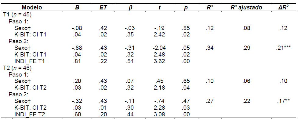 La Tabla 4 sintetiza los principales indicadores de los modelos de regresión para explicar el involucramiento escolar en T3 mediante las variables independientes colectadas en T1 y T2. Para el T1, el modelo 1 con las variables Sexo y CI, la varianza explicada fue de R² = .12, F (2, 42) = 2.95, p = .06. En el modelo 2, que incluye a la subescala de FE del INDI como variable retenida por el modelo, los indicadores fueron R² = .34, F (3, 41) = 6.90, p = .001. El cambio en la varianza explicada del modelo fue significativo; ΔR2 = .21, ΔF (1, 41) = 13.11, p = .001. Para el T2, el modelo 1 (con las mismas variables) arrojó un R2 = .10, F (2, 43) = 2.48, p = .095. Entretanto, el modelo 2, que también adicionó solamente a la subescala FE del INDI mostró un R² = .27, F (3, 42) = 5.15, p = .004. Al igual que en el modelo 2 del T1, la inclusión de la variable FE del INDI aumentó significativamente la varianza explicada total del modelo de T2; ΔR2 = .16; ΔF (1, 42) = 9.49, p = .004.