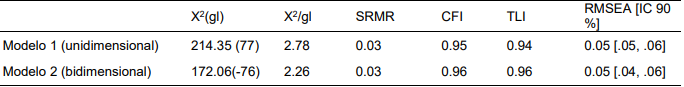 La Tabla 3 muestra el AFC donde se comparó dos modelos propuestos. El Modelo 1 con 14 ítems y un solo factor mostró adecuados índices de ajustes (CFI = .95, TLI = .94, RMSEA = .05, IC 90% [.05, .06]) y las cargas factoriales fueron superiores a .40 en todos los ítems (ver Figura 1). Asimismo, se optó por analizar el Modelo 2 con catorce ítems y dos factores también mostró mejores índices de ajuste (CFI = .96, TLI = .96, RMSEA= .05, IC 90% [.04, .06]). No obstante, se halló que la correlación entre dichos factores es de .92.
