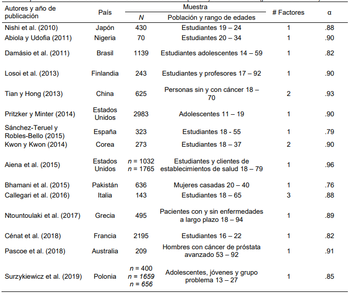 La RS-14 ha sido estudiada en diversos grupos poblacionales como adolescentes, estudiantes, adultos, profesores, trabajadores, mujeres casadas, pacientes con y sin enfermedades de larga duración y oncológicas. Asimismo, ha sido traducida y validada a diversos idiomas mostrando una estructura interna de un único factor con adecuadas propiedades psicométricas para medir la resiliencia (ver Tabla 1) (Abiola & Udofia, 2011;Aiena et al., 2015;Bhamani et al., 2015; Cénat et al., 2018;Damásio et al., 2011;Losoi et al., 2013;Nishi et al., 2010; Ntountoulaki et al., 2017; Pascoe et al., 2018; Pritzker & Minter, 2014; Sánchez-Teruel & Robles-Bello, 2015;Surzykiewicz et al., 2019). No obstante, hay estudios que han evidenciado una estructura de dos factores (Kwon & Kwon, 2014; Tian & Hong, 2013) y hasta de tres factores (Callegari et al., 2016), por lo cual es necesario realizar más estudios que ayuden a consolidar la estructura interna del RS-14.