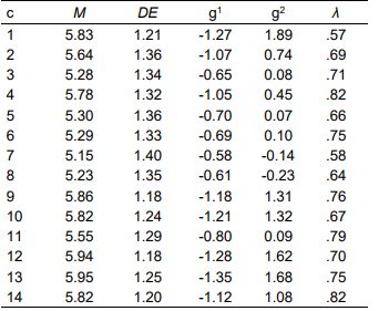 LaTabla 2 presenta los resultados de los estadísticos descriptivos de los ítems, donde se evaluó la media, desviación estándar, asimetría y curtosis. Se encontró que en la media el ítem 13 presenta mayor puntaje (M = 5.95, DE = 1.25) y el ítem 7 presenta menor puntaje (M = 5.15, DE = 1.40). En cuanto a la asimetría y curtosis se encontró valores cercanos o superiores a +/- 1.5 (Forero et al., 2009).