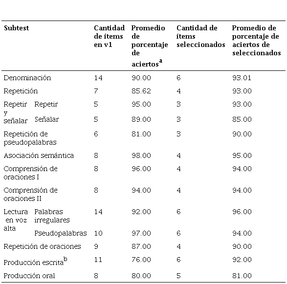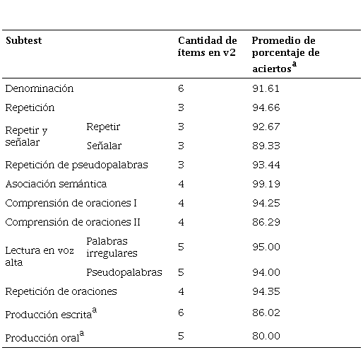A continuación, se presenta el resumen de los porcentajes de aciertos de los ítems originales (v1) administrados a la muestra 1 (Tabla 2). Además de esta información cuantitativa, se observó una adecuada comprensión de las consignas traducidas.