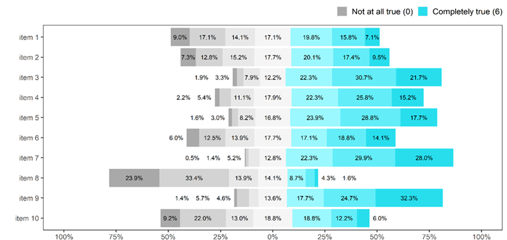 An item analysis was conducted to examine descriptive statistics and assumptions for further procedures. As items are ordinal-level variables (Stevens, 1946), their treatment as interval-level variables requires at least five response categories and approximately normal distributions (Bandalos & Finney, 2018; Lloret-Segura et al., 2014; Watkins, 2018). Thereby, values of skewness (γ̂1) and kurtosis (γ̂2) greater than 2 were delimited to determine several deviations for normality (Muthén & Kaplan, 1985). A divergent stacked bar plot (Heiberger & Robbins, 2014) was employed to compare item response distributions, as well as examine relative frequencies on each category as indicator of floor/ceiling effects, and response styles (Van Vaerenbergh & Thomas, 2013) such as Aquiescence/Disaquiescence Response Style (ARS/DARS), Extreme Response Style (ERS), Mid Response Style (MRS).