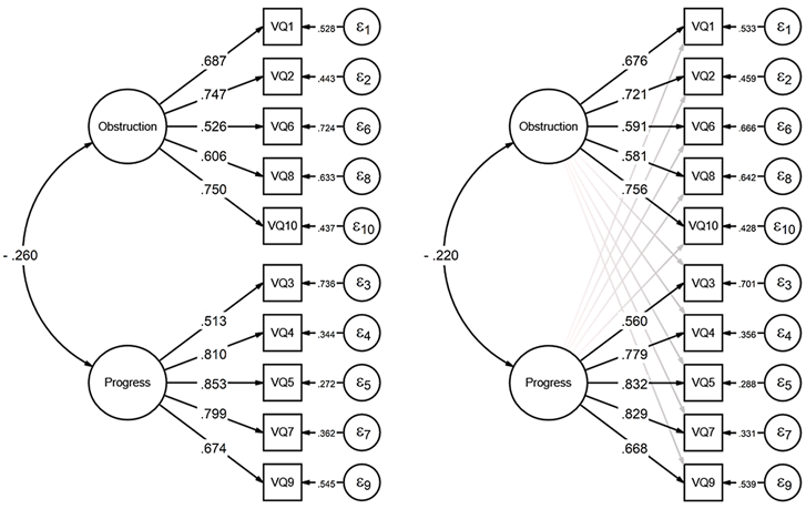 Note. VQ’s CFA model is shown on the left, while ESEM is shown on the right. Gray paths on the ESEM model indicate that items could load on both latent constructs.