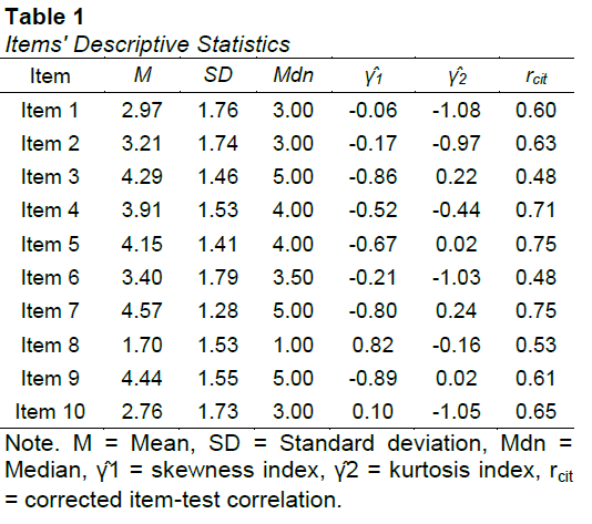 Items’ descriptive statistics are presented in Table 1. Skewness and kurtosis indexes show non-several deviations from univariate normality. Therefore, treatment of items as interval-level variables is supported (Bandalos & Finney, 2018; Lloret-Segura et al., 2014; Watkins, 2018). CTT discrimination indexes indicate that most items contribute with large amounts of information about the participants latent trait rcit = .48 - .75. CTT endorsement indexes manifest that items provide information across the entire latent trait continuum M = 1.70 – 4.44. No missing values nor significant outliers regarding response patterns were detected.