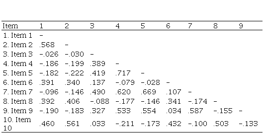 Table 2 shows the items’ Pearson correlation matrix. Moderate (r > .30) and large (r > .50) positive relationships were found for items that belong to the same dimension; on the contrary, negative relationships between items from different dimensions were small (r < .30) or irrelevant (r < .10). Kaiser-Meyer-Olkin test (Kaiser, 1974) suggested that the correlation matrix is appropriate for factor analysis KMO = .83. Additionally, Bartlett test of Sphericity indicated statistically significant relationships between items χ2 [9, N = 368] = 78.683, p < .001.