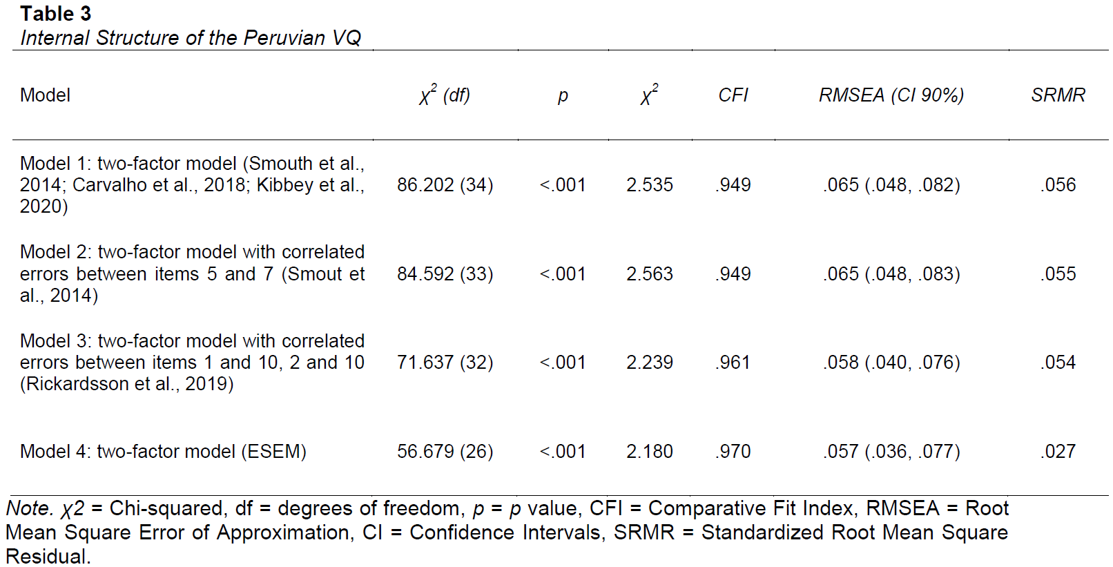 The aim of the current study was to identify psychometric properties of the present measure in a mostly non-clinical sample of Peruvian adults. Data analysis methods from previous studies on the VQ (e.g., Carvalho et al., 2018; Kibbey et al., 2020; Smout et al., 2014) were implemented, along with new proposals (e.g., ESEM, FSR) to assess validity, reliability, and fairness.