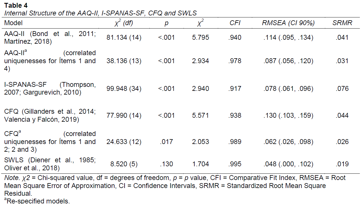 Before testing relationships between variables, all measures’ internal structures were assessed through CFA, based on theoretical measurement models (see Table 4). High values of RMSEA for the AAQ-II and CFQ were found; thus, both models were re-specified. The AAQ-II model correlated errors between items 1 and 4 were allowed, based on previous studies (Edwards & Vowles, 2020); this modification improved fit significantly. Similarly, correlated errors for items 1 and 2, 2 and 3 were allowed in CFQ based on previous works (Lucena-Santos et al., 2017), yielding a better fit. High average extracted variance and internal consistency measures were estimated for the re-specified AAQ-II (AVE = .608, ω = .905); I-SPANAS-SF dimensions, Positive affect (AVE = .380, ω = .730), and Negative affect (AVE = .422, ω = .750); re-specified CFQ (AVE = .592, ω = .893); and SWLS (AVE = .572, ω = .870).