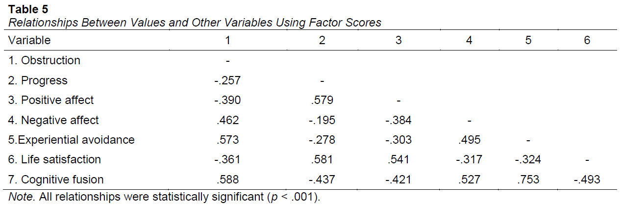 Validity evidence based on the relationship with other variables was established through convergent and discriminant studies. All correlations were consistent with theoretical premises. For instance, Obstruction is defined as a constant focus on undesired psychological experiences, the avoidance processes facing them, and the inattention of those values and aspects relevant to the subject’s life as a consequence (Smout et al., 2014); moderate to large positive relationships with experiential avoidance, cognitive fusion, and negative affect, and the moderate negative associations with positive affect and life satisfaction demonstrate a great degree of theoretical and empirical consistency (Carvalho et al., 2018; Pérez, 2014; Polk et al., 2016). Similarly, Progress is defined as the awareness of those personal elements considered relevant and important, which promote processes of perseverance and directionality (Hayes et al., 2012). Both the large positive associations with life satisfaction and positive affect, as well as the moderate negative associations with experiential avoidance and cognitive fusion have a conceptual sense highly congruent with the underlying theory, and previous research (Rickardsson et al., 2019; Hayes et al., 2012).