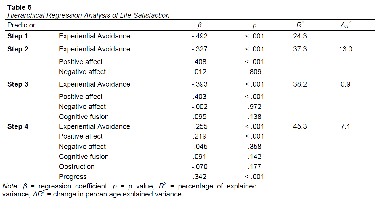 Results from Hierarchical Regression are shown in Table 6. Obstruction and Progress improved life satisfaction prediction ∆R2= 7.1%. In addition, Progress was a strong statistically significant predictor of life satisfaction (p < .001), after controlling for other variables.
