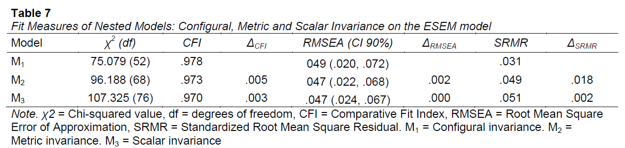 Measurement invariance was assessed across gender groups to assure equanimity in the ESEM model (AERA et al., 2014; ITC, 2017). Nested models were compared to determine equivalence of model form (i.e., configural), factor loadings (i.e., metric) and items’ intercepts (i.e., scalar). Incremental indexes ∆CFI, ∆RMSEA and ∆SRMR were computed to determine presence of invariance (Putnick & Bornstein, 2016; Rutkowski & Svetina, 2014), in which values of ∆CFI > .010, ∆RMSEA > .015 and ∆SRMR > .030 indicated significant changes between models (Chen, 2007).
