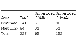 La muestra estuvo conformada por 225 estudiantes universitarios de universidades de gestión privada y de gestión pública de 18 a 25 años (tabla 1). La muestra fue no probabilística y por conveniencia, siendo el criterio de inclusión estar cursando alguna carrera universitaria. Los participantes fueron contactados por el equipo investigador a través de amigos y conocidos, siendo la participación voluntaria (todos firmaron un consentimiento informado para participar de la investigación). Como criterio de exclusión se utilizaron aquellos que eran menores de 18 años, mayores de 25 años, y/o no estaban cursando una carrera universitaria.