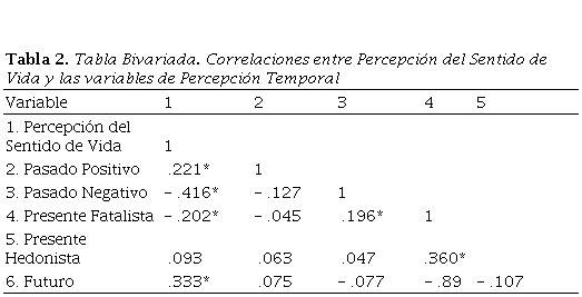 Al existir la correlación directa entre percepción de sentido de vida y percepción temporal orientada al pasado positiva se podría considerar que aquellas personas que le encuentran sentido a su vida suelen tener una integración respecto a la temporalidad, puesto que asumen su pasado como un aspecto de su historia; y tienen una mejor orientación hacia el futuro. Frankl (2007) sostiene que el pasado está asegurado para la eternidad, porque el pasado es el modo más seguro de ser. Pudiendo reforzar la idea de Zimbardo y Boyd (1999) que el pasado positivo implica una perspectiva saludable ante la vida.