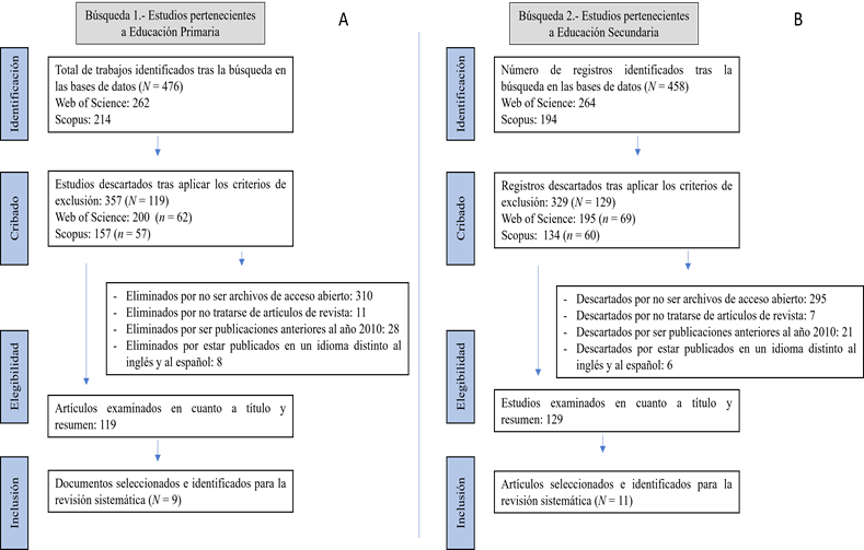 LaFigura 1 muestra el procedimiento establecido para la selección de la muestra de artículos de ambas búsquedas en esta revisión sistemática. En la primera búsqueda (Figura 1A) se han obtenido un total de 476 documentos que, tras aplicar los filtros anteriormente comentados, se han reducido a 119. Una vez examinados de manera detallada e incluidos los criterios de elegibilidad dichos artículos se han incluido en esta revisión nueve estudios provenientes de la etapa de educación primaria.