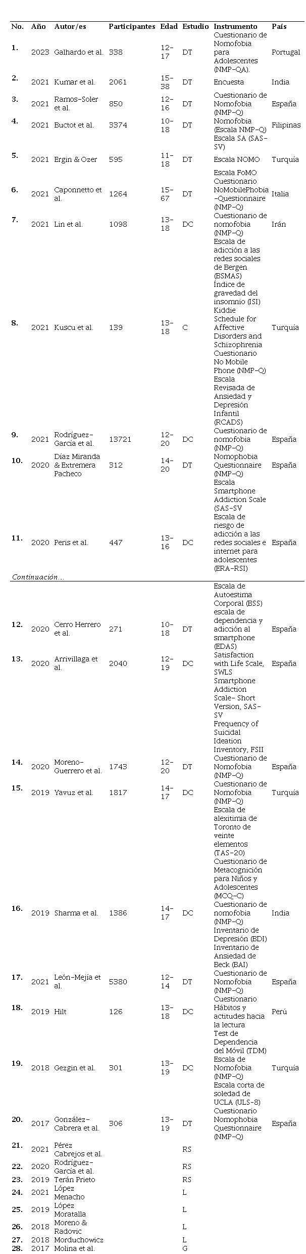 El presente artículo de revisión sistemática contiene un proceso de recopilación, agrupación y evaluación de diferentes artículos científicos sobre la temática que han sido publicados en revistas científicas en los últimos cinco años, en las áreas de pediatría, psiquiatría, psicología y salud mental, y que se encuentran disponibles para su consulta. Se descartaron artículos que no se interesan por el tema (nomofobia) en específico, ya que se puede confundir términos con otras adicciones, además los de opinión o que no pertenecieran a revistas indexadas. De igual manera, estudios que no incluían entre su muestra a adolescentes.