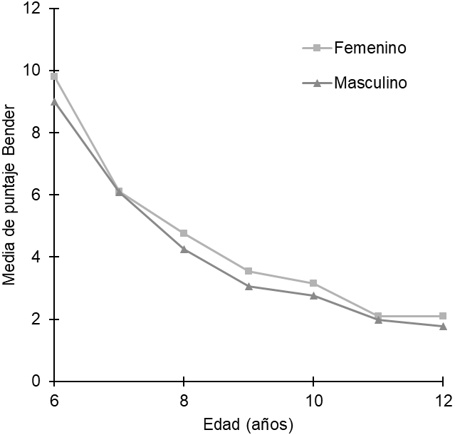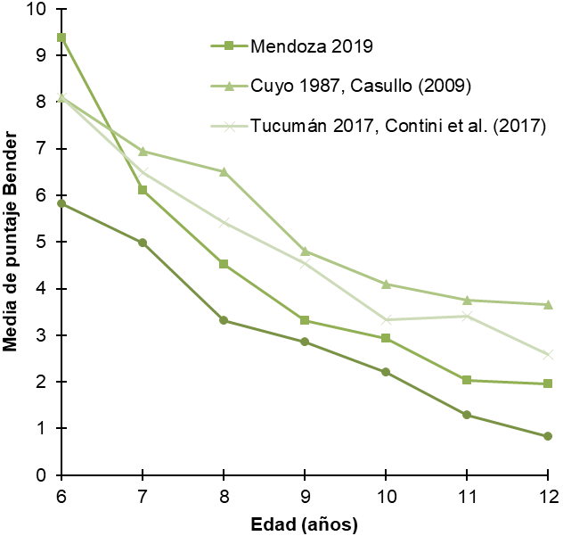 También es destacable que niños y niñas de 12 años de edad del Gran Mendoza no obtuvieran medias de puntaje nulas, sino de 1.95 puntos. Esto coincide con lo observado por otros investigadores como Contini et al. (2017) y Pelorosso et al. (2004). Retomando sus discusiones, es probable que estas diferencias se deban a una maduración más lenta de la función visomotora con respecto a la población estadounidense analizada por Koppitz (1964), por lo que futuras investigaciones podrían evaluar edades superiores a los 12 años hasta encontrar un puntaje nulo.
