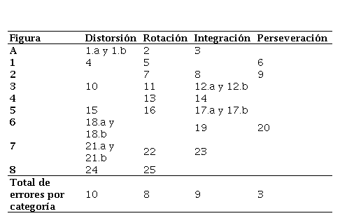 Se utilizó el Test Guestáltico Visomotor de Bender (1938), compuesto por nueve figuras, junto con el sistema de puntaje de Koppitz (1964). Este establece cuatro grupos principales de errores: la distorsión de formas y desproporciones entre las figuras, la rotación, la integración y omisión y la perseveración.