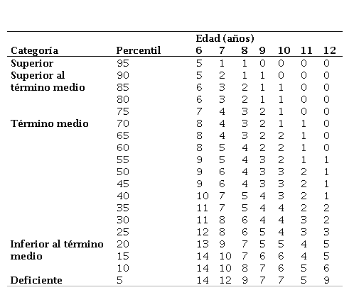 Posteriormente, se elaboraron baremos diferenciados para cada grupo de edad (Tabla 3) y de acuerdo con las categorías diagnósticas utilizadas por Contini et al. (2017): superior, superior al término medio, término medio, inferior al término medio y deficiente.