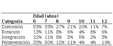 En la Tabla 4 se presenta el porcentaje de error agrupando los ítems evaluados por cada una de las categorías (distorsión y desproporción, rotación, integración y omisión y perseveración). Los resultados también mostraron una tendencia general decreciente con la edad en las categorías analizadas. El llamativo aumento observado a la edad de 12 años en el grupo de perseveración podría deberse a que esta categoría está subrepresentada, pues posee solo tres ítems en la valoración; o bien, a que no se relaciona tan directamente con la función visomotora a esa edad. Por otro lado, es notable la poca variación con la edad que tiene la frecuencia de errores agrupados en la categoría de rotación. Algo similar ocurre con la integración. Por el contrario, la distorsión fue la categoría de más fuerte tasa de cambio con la edad (Figura 2).