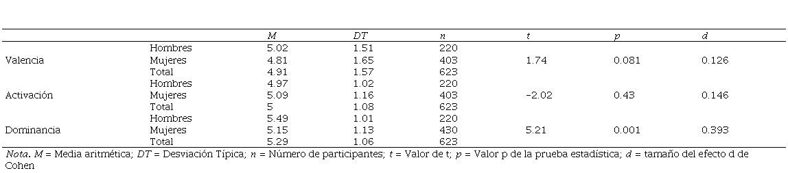En la Tabla 3 se presentan los estadísticos descriptivos y las diferencias de medias para hombres y mujeres, en la cual observamos que con un nivel de significación del 1%, solamente se hallaron diferencias significativas para la dimensión dominancia comparando los grupos de mujeres y hombres.