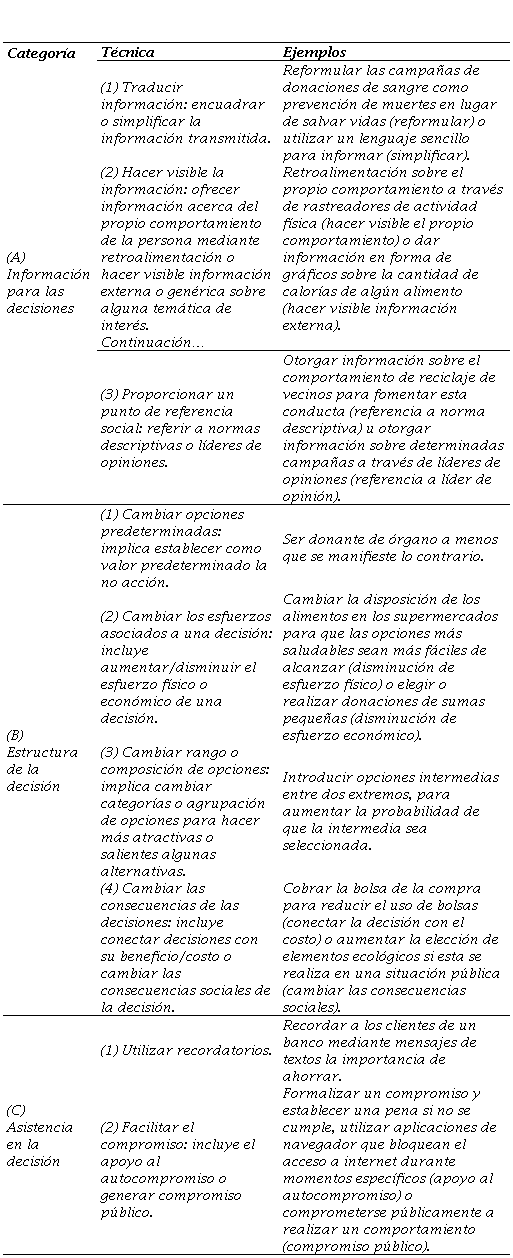 Teniendo en cuenta la taxonomía elaborada por Münscher et al. (2016; Ver Tabla 1), todos los estudios seleccionados utilizaron técnicas de nudges que se ubican dentro de la categoría de “información para la decisión”, la cual incluye diversas técnicas dirigidas a presentar información relevante sin alterar las opciones que las personas tienen a la hora de tomar decisiones (ver Tabla 2; Adler et al., 2017; Daskalova et al., 2018; Filion et al., 2015; Mitchell et al., 2021; Schneider et al., 2023; Tavernier & Adam, 2017). Tres de estos estudios, además, combinaron técnicas de dicha categoría con técnicas de otras categorías. Dos de ellos las combinaron con técnicas ubicadas en la categoría de “asistencia en la decisión”, las cuales tienen como finalidad disminuir la brecha existente entre el comportamiento y la intención de realizarlo (Daskalova et al., 2018; Tavernier & Adam, 2017). El restante estudio las combinó con técnicas dentro de la categoría de “estructura de la decisión”, que son aquellas que cambian las características de las opciones que las personas tienen disponibles a la hora de tomar decisiones (Mitchell et al., 2021).