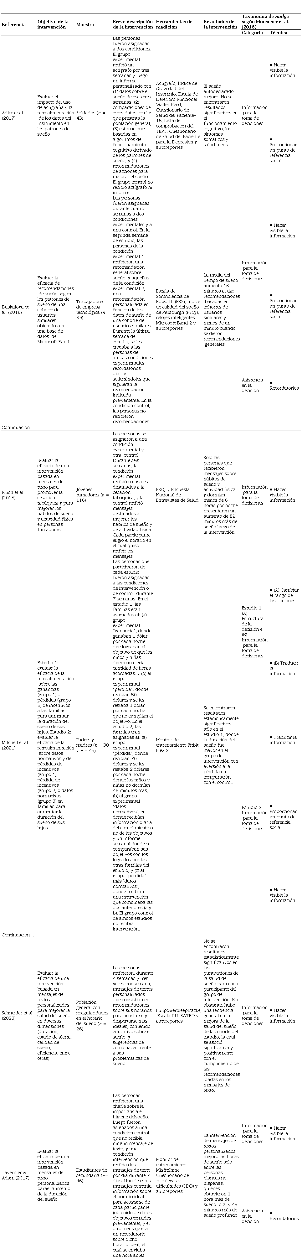 En la Tabla 2 se resumen los principales resultados de cada uno de los estudios seleccionados. La Tabla se organizó según los siguientes datos, los cuales fueron extraídos de los estudios: referencia del estudio, objetivo de la intervención, tamaño de la muestra, breve descripción de la intervención (diseño y duración), herramientas de medición de las variables de estudio (medidas subjetivas y/o objetivas), resultados de la intervención, y categoría y técnica de la intervención según la taxonomía de nudgepropuesta por Münscher et al. (2016).