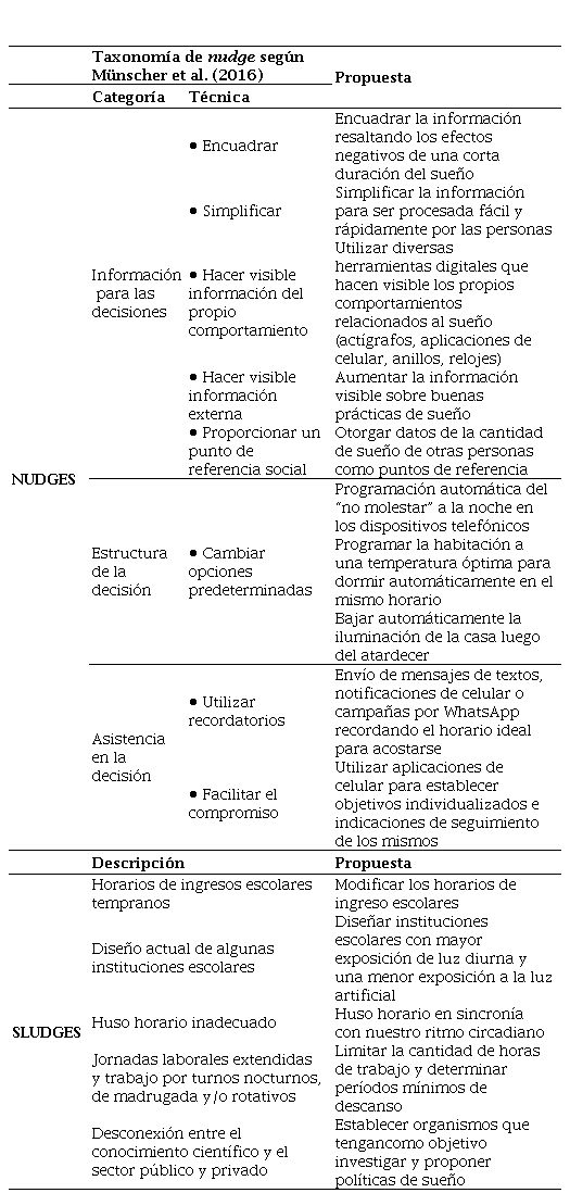 Dado el vacío de estudios sobre nudges y sueño expuesto recientemente, resulta interesante realizar en este apartado una serie de propuestas sobre posibles intervenciones que tengan como conductas objetivo hábitos que mejoren la cantidad de horas que las personas duermen, teniendo como base la ya mencionada taxonomía de Münscher et al. (2016). El listado de estas propuestas se puede encontrar en la Tabla 3.