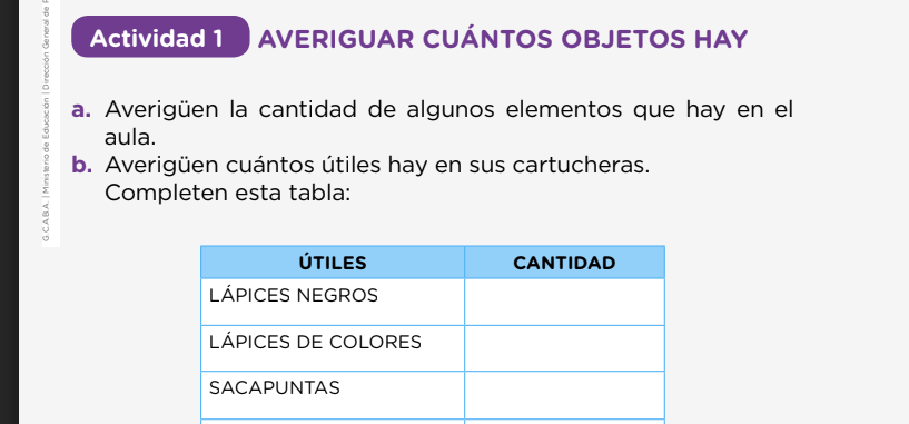 En la serie de propuestas didácticas de Matemática para primer grado, elaborada por la Dirección General de Planeamiento Educativo (2020) del Ministerio de Educación de Ciudad de Buenos Aires, se presentan diferentes actividades que tienen el objetivo de que los alumnos y alumnas avancen en el dominio del conteo y de la lectura y escritura de números, respondiendo a los Núcleos de Aprendizajes Prioritarios (NAP) vigentes para esa área.