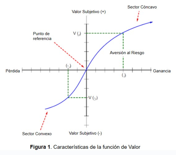 La función de valor (Figura 1) trabaja de manera similar a la función de utilidad en la TUE (Oliveira, 2007), pero con las siguientes modificaciones fundamentales. Primero, desde la Teoría Prospectiva las ganancias y pérdidas se definen en relación con un punto de referencia. En este sentido, Kahneman y Tversky (1987) señalaron que el valor subjetivo no está adecuadamente representado por una utilidad marginal monotónica basada en la riqueza, como propone la TUE (Phillips et al., 2004); sino que depende de un punto de referencia en base al cual realizamos una valoración de determinado fenómeno o suceso (Kahneman, 2003). Otra de las cuestiones fundamentales es que la función del valor está torcida en el punto de referencia: por encima del punto el valor subjetivo aumenta con una función cóncava, y por debajo el valor subjetivo disminuye con una función convexa. De este modo, la función de valor queda representada en forma de S. Esto también implica que las personas son adversas al riesgo en decisiones que involucran ganancias y propensas al riesgo en las decisiones que involucran pérdidas (Tversky & Kahneman, 1981). Tercero, la función del valor tiene una naturaleza desigual de la curva para ganancias y pérdidas, siendo más pronunciada en las pérdidas. En este sentido, el displacer asociado a la pérdida de una suma de dinero es generalmente mayor que el placer asociado a la ganancia del mismo monto (Tversky & Kahneman, 1981).