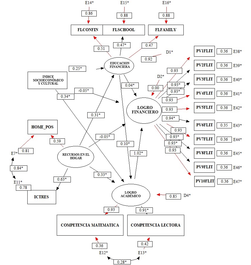 Nota. Datos de bondad de ajuste del modelo obtenido. Chi Sq. = 6514.30, p = .001. CFI = 0.94. RMSEA = 0.9. * Valor estimado por el modelamiento. E: Error residual de la variable manifiesta y el factor al que pertenece, es el monto de relación entre estos dos que no es explicado por su relación. D: Disturbio o error residual para los factores dependientes de otros factores o variables manifiestas, es el monto de la relación entre estos dos que no puede ser explicado por su relación; HOME_POS: Posesiones en el hogar; FLCONFIN: Confianza en temas financieros en general; FLSCHOOL: Educación financiera en las lecciones escolares; FLFAMILY: Involucramiento de los padres en temas de educación financiera; ICTRES: Recursos de comunicación, informáticos y tecnológicos que posee el respondiente en casa; PV1FLIT a PV10FLIT: Diez valores plausibles de la Competencia Financiera.