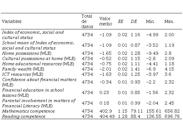 Para las variables tanto del factor Posesión familiar como del factor Recursos tecnológicos en el hogar, y Alfabetización financiera, se eligieron los puntajes estandarizados proporcionados por PISA 2018 (WLE, por las siglas en inglés de Weighted Likelihood Estimates). Los otros puntajes individuales variables de los participantes, los puntajes fueron estandarizados con una media de 0 y una desviación estándar de 1 entre todos los valores de los países de la OECD.
