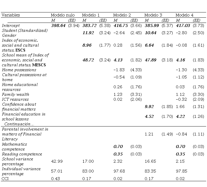 La tabla 2muestra los resultados obtenidos en los análisis jerárquicos lineales. El orden de los modelos analiza la paulatina incorporación de las variables predictoras del logro financiero: el modelo nulo establece la varianza entre escuelas e individuos; el primer modelo analiza la influencia que las características del respondiente como es el género, el nivel socioeconómico y cultural individual y el de la escuela tienen en el desempeño de cada estudiante; posteriormente, el modelo 2, además de las variables ya citadas, agregó el aporte de los recursos que los estudiantes poseen en su casa, el desempeño obtenido en las competencias de lectura y matemática y su impacto en el logro financiero; el tercer modelo cuenta con las variables de educación financiera en el hogar y en casa, controlando los efectos de las características personales; el cuarto y último modelo, incorpora todas las variables predictoras consideradas en el estudio.