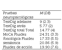 Se utilizó para todos los análisis el programa SPSS v26.0©. Se extrajeron medidas de tendencia central y de dispersión, tanto para el subtest Retención de Dígitos-WAIS III en sus tres puntuaciones brutas (dígitos hacia adelante, dígitos hacia atrás y dígitos total), como para el total MoCA y tres tareas de fluidez.