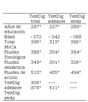 Tal como se informa en la Tabla 2, “dígitos total”, “dígitos hacia adelante” y “dígitos hacia atrás”, correlacionaron en forma positiva con el total MoCA y con las tres tareas de fluidez verbal.