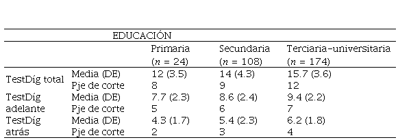 En la Tabla 3 se exponen los valores normativos para el subtest Retención de Dígitos- WAIS III según tres niveles educativos. La edad no fue incluida como factor de ajuste porque, tal como se observa en la Tabla 2, esta variable no influyó en la ejecución de la prueba.
