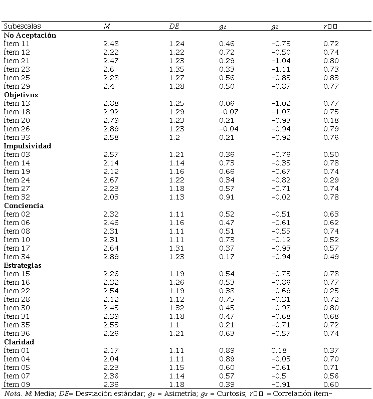 La Tabla 2 presenta los estadísticos descriptivos de todos los ítems de la DERS. Como se observa, en todos los casos la media se halló en torno a 2 y la DE en torno a 1. Asimismo, los valores de asimetría y curtosis estuvieron dentro del rango [-1, +1] o, en todo caso, muy ligeramente fuera de este. Al examinar las correlaciones ítem-test en cada subescala por separado, se observó, en general, una adecuada consistencia en cada una.