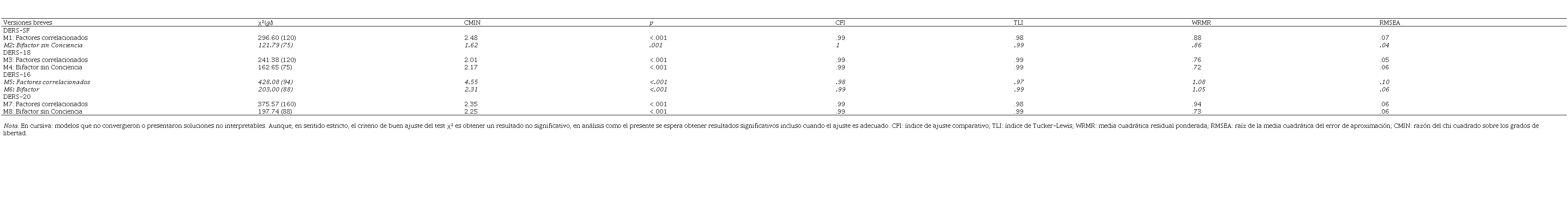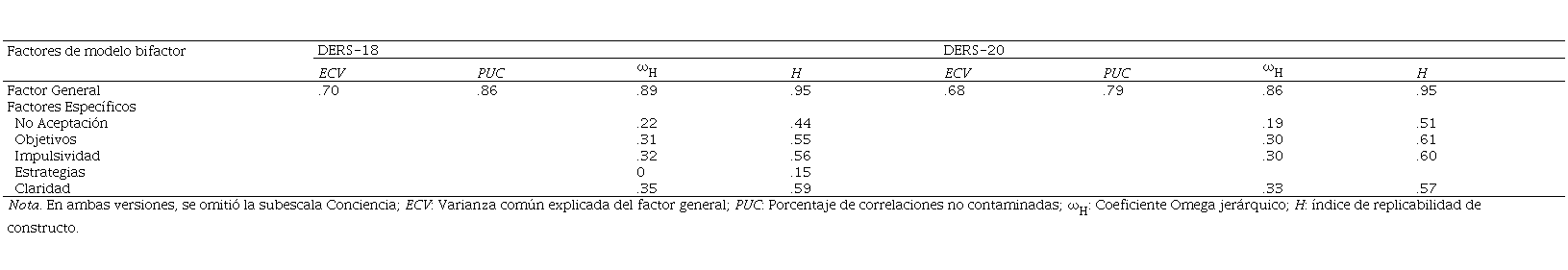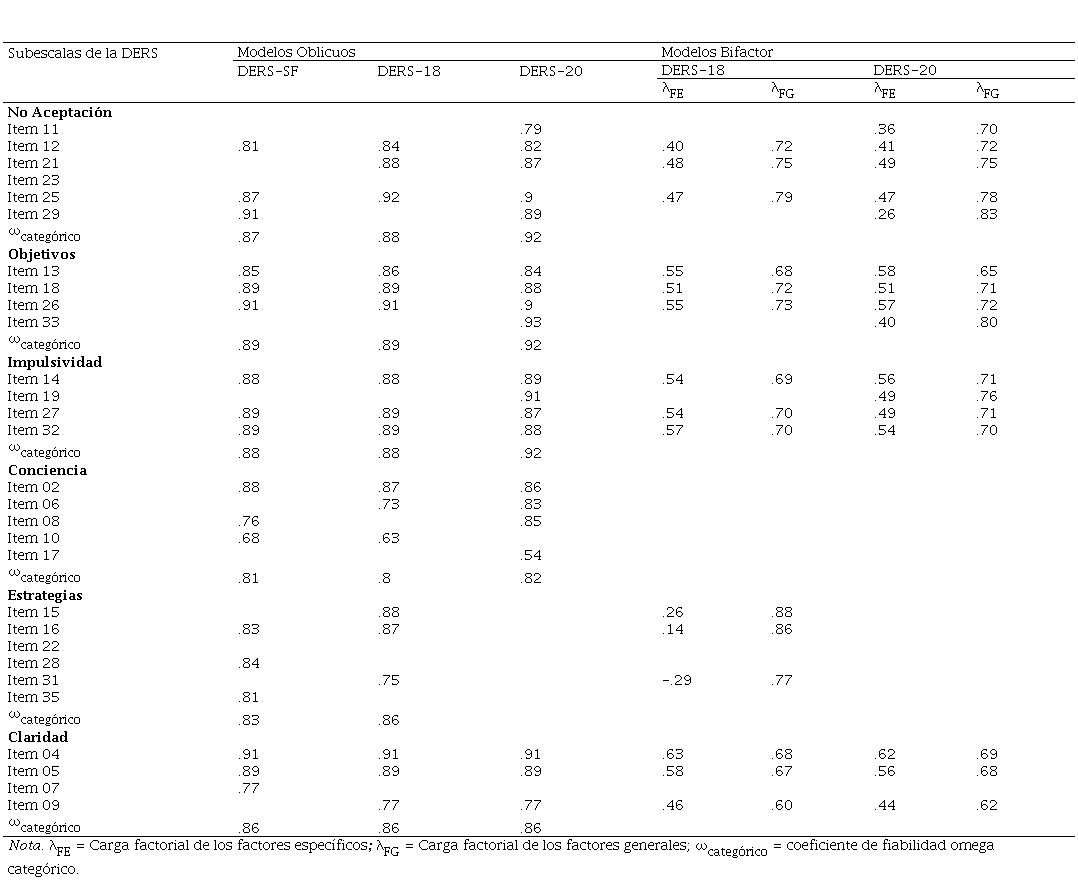 Se pusieron a prueba los modelos breves presentados en la Tabla 1, así como modelos bifactor basados en estos, pero exceptuando a los ítems de Conciencia. Como se observa en la Tabla 3, los modelos breves oblicuos mostraron un adecuado funcionamiento psicométrico, con excepción de la DERS-16, con el que no se llegó a una solución interpretable y, además, se obtuvieron índices de ajuste subóptimos. Por otra parte, dos de los modelos bifactor también presentaron soluciones inadecuadas (p. ej., casos Heywood). Los otros dos modelos bifactor (basados en los modelos oblicuos DERS-18 y DERS-20) mostraron índices de ajuste adecuados y muy parecidos entre sí.