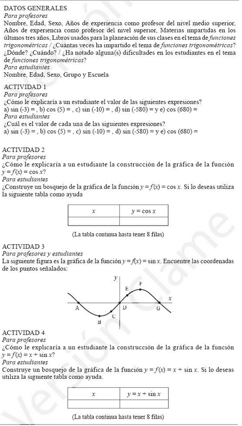 De esta manera, nuestra principal hipótesis es que alguna parte de aquellos y aquellas que contesten el cuestionario muestren rupturas conceptuales relacionadas con el concepto de radián. En términos generales el cuestionario para estudiantes y profesores fue el mismo. Las diferencias consistieron en que a los profesores se les pidió información sobre su experiencia docente alrededor del tema de las FF. TT. y se redactaron las actividades matemáticas con la frase "¿Cómo explicaría a sus estudiantes..." y en el cuestionario para estudiantes se sugirió el uso de tablas para apoyar la graficación.