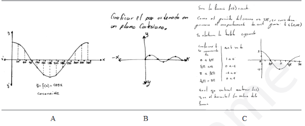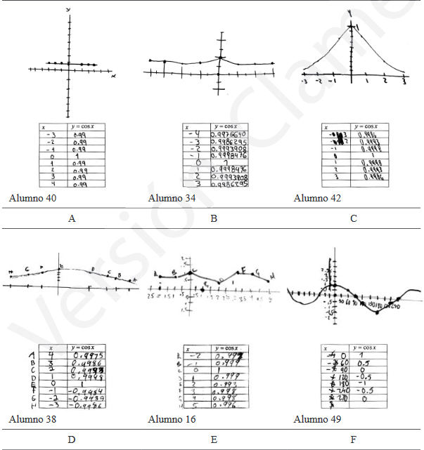 En la Actividad 1 se puede notar que los estudiantes no lograron dotar de particularidades a la función coseno; ya que mayoritariamente utilizan valores naturales "pequeños" {–3, –2, –1, 0, 1, 2, 3} utilizados en la escuela para la graficación de otras funciones. Sólo un estudiante recurre a los valores notables de las FF. TT. (sin expresar unidades): {0, 60, 90, 120, 180, 240, 270}. Esto puede ser interpretado como señal de una escasa manipulación de las unidades de medida de las funciones trigonométricas en la matemática escolar por parte del los estudiantes del CECYT.