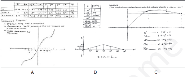 En la Actividad 4, sólo 3 de los 12 profesores presentaron una gráfica. Uno de los tres bosquejó la gráfica (Tabla III–A) interpretando el sumando x como número real (tomando en cuentalos valores notables: ) y la x del sumando sin x fue interpretada como radián. En otras palabras, sólo un profesor de los 12 presentó la gráfica "matemáticamente correcta". Los otros dos profesores que presentaron una gráfica (Tabla III–B y III–C) interpretaron el sumando x como número real y la x del sumando fue interpretado como grado. Tres de los profesores que no elaboraron gráficas, presentaron argumentos simililares. Uno de ellos menciona que "es la misma función trigonométrica seno pero desplazada una distancia x", otro al dar significado a la expresión x + sin(sin(x) cambia el primer sumando por una constante a y el tercero menciona que "podemos realizar la gráfica de sin x y después desfasarla en x". En los tres casos al interpretar la expresión x + sin(sin(x) como una función más una constante se evoca un ejercicio típico de graficación (coloquialmente: una función + una constante) que en términos gráficos corresponde a un desplazamiento vertical.