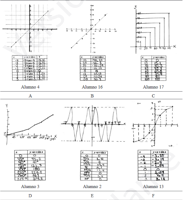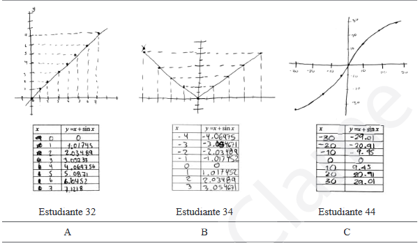 El 13 % (4 de 31) de los estudiantes llenaron la tabla pero no presentaron gráficas. Todos interpretaron la suma x + sin x sin asignar unidades a x. El 100% de este subgrupo de estudiantes utilizó números naturales sin relación aparente con los valores notables de las FF. TT. y tres de ellos usaron la calculadora en modo sexagesimal y el otro uso el modo radianes.