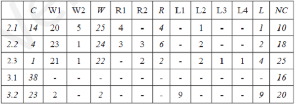 To better interpret Table I, some considerations need to be made. In order to make it easier to understand the structure of the pattern in the second task of the test, we presented an image of the first two elements of the sequence. In spite of this fact, only fourteen students used counting as a solving strategy, favouring instead a numerical approach such as direct proportion (W1). Four students made a drawing to solve the first two questions and applied direct counting to determine the number of beads, but they were not able to solve the last question using the same method, since it involved far generalization, so they left it in blank or a feeble attempt was made to solve it. The few students that successfully solved questions 2.1 and 2.2 of this task used counting or recursive reasoning (extending the given sequence, strategy R1). There was a general tendency to maintain the same strategy for the three questions of the second task. However some students started using the counting strategy, although for the far generalization, they shifted to a direct proportion model.