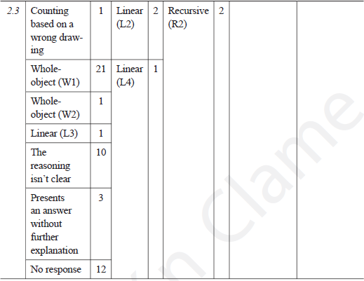 Considering the nature of the tasks and the analysis of the work carried out by the students, we felt the need to adjust Stacey's (1989) strategy categorization in order to describe, as accurately as possible, their reasoning. We established four main categories: counting, whole-object, recursive and linear. In some cases, we considered that a particular category had to be divided into different approaches due to the structure of reasoning presented.