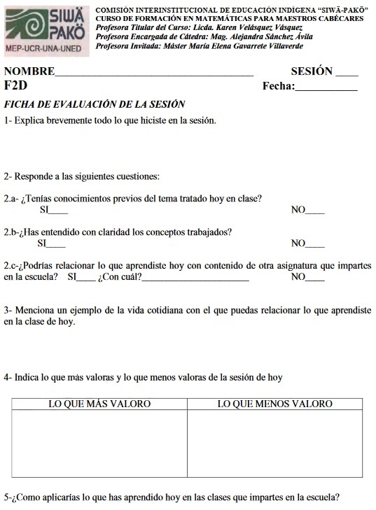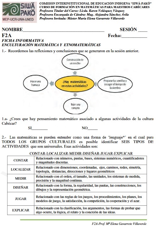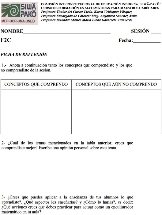 Además, realizamos un seminario con la Comisión de Enlace y el Equipo Investigador de la Carrera de Bachillerato en I y II ciclo con énfasis en Lengua y Cultura Cabécar. El debate trató sobre las expectativas y planificación del curso de matemáticas del PISP, en el que se inserta nuestra propuesta. Esta experiencia fue audio-grabada para poder analizar su contenido y conocer los aspectos a tomar en cuenta para el diseño de nuestra intervención.