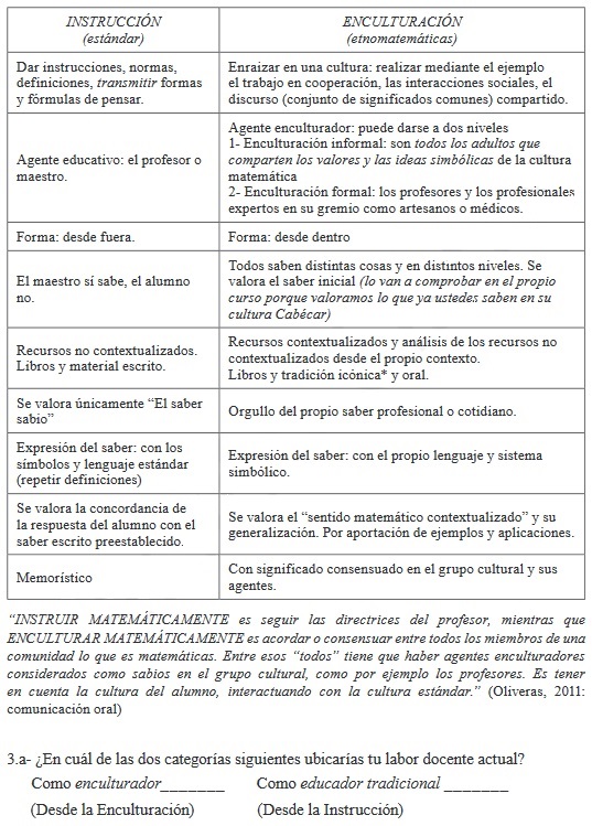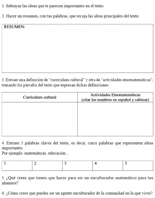 Desde nuestro punto de vista, es importante poner de manifiesto este hecho, hacerlo visible a los ojos de los educadores durante su formación, pues deseamos promover la interculturalidad mediante la educación matemática crítica, que cuestione los presupuestos educativos y socioculturales, es decir que trate de cambiar la realidad social y científica, buscando un mestizaje creativo (Oliveras, 2002, 2006).